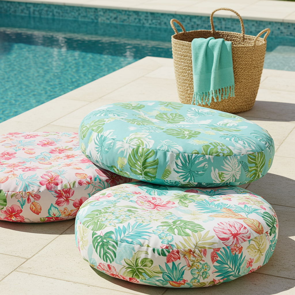 The Outdoor Printed floor cushions are fantastic for any home in any style. I love the idea and the bright summer colors. They are perfect for anyone to lounge on when you're entertaining. $129 each.